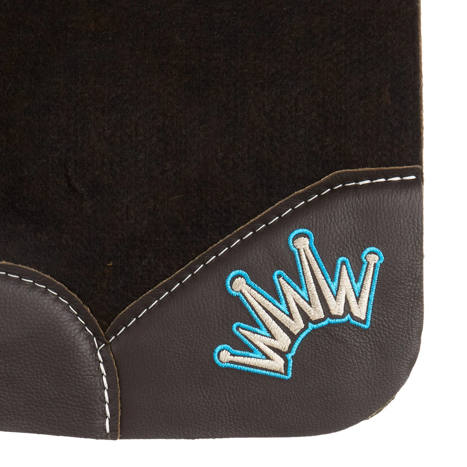 - Turquoise embroidered crown on the front and a turquoise and cream crown on the rear corner leather.