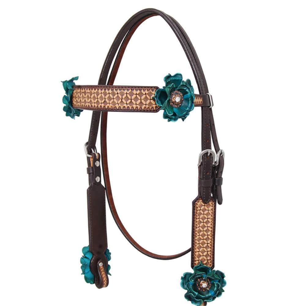 The beautiful Vintage Turquoise Flower collection from Circle Y. This browband headstall is designed with two-tone stamping and fringe accents on the front. Finished with turquoise leather flowers and rhinestone conchos. 1012-10-SV