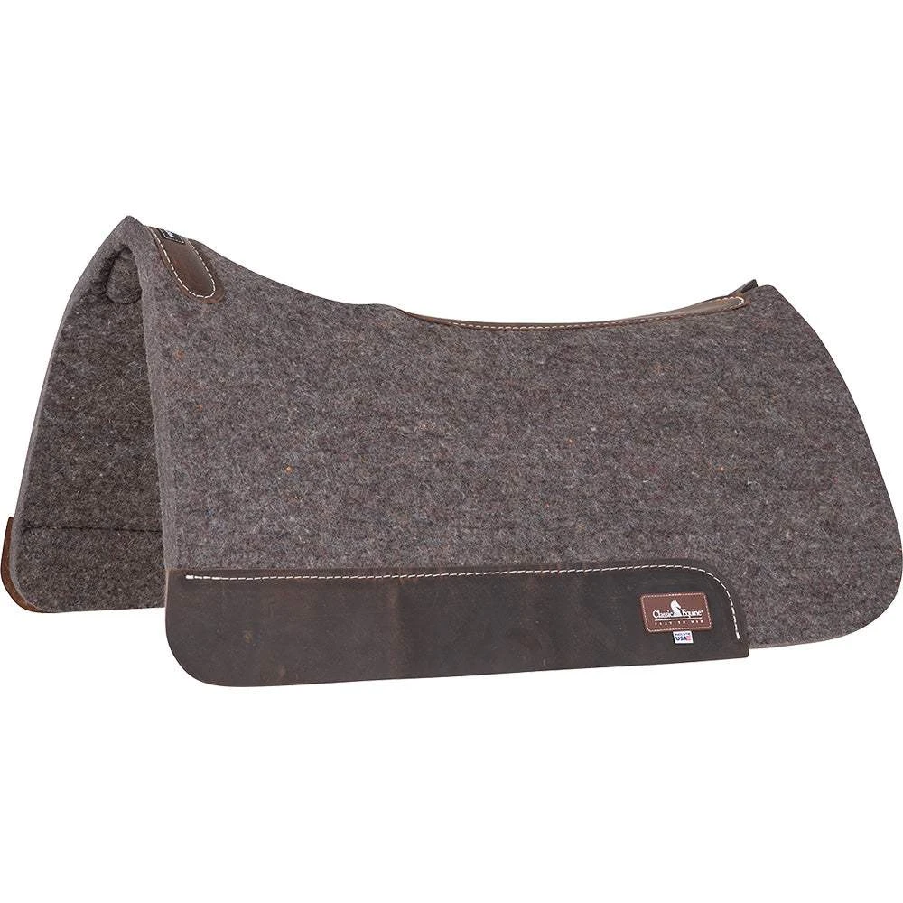 Made with an advanced grade 100% wool, consisting of 80% virgin fibers Felt is pressed for better compression rebound and a much longer life than typical synthetic or needled felt pads Superior ability to disperse pressure, wick away moisture and diffuse heat Super soft and pliable, it easily and naturally conforms to the horses back The Classic Equine 100% Wool Felt Saddle Pad Extremely durable, long lasting and provides increased shock absorption and comfort against your horse cut out over withers and contoured to fit close to your horses back.