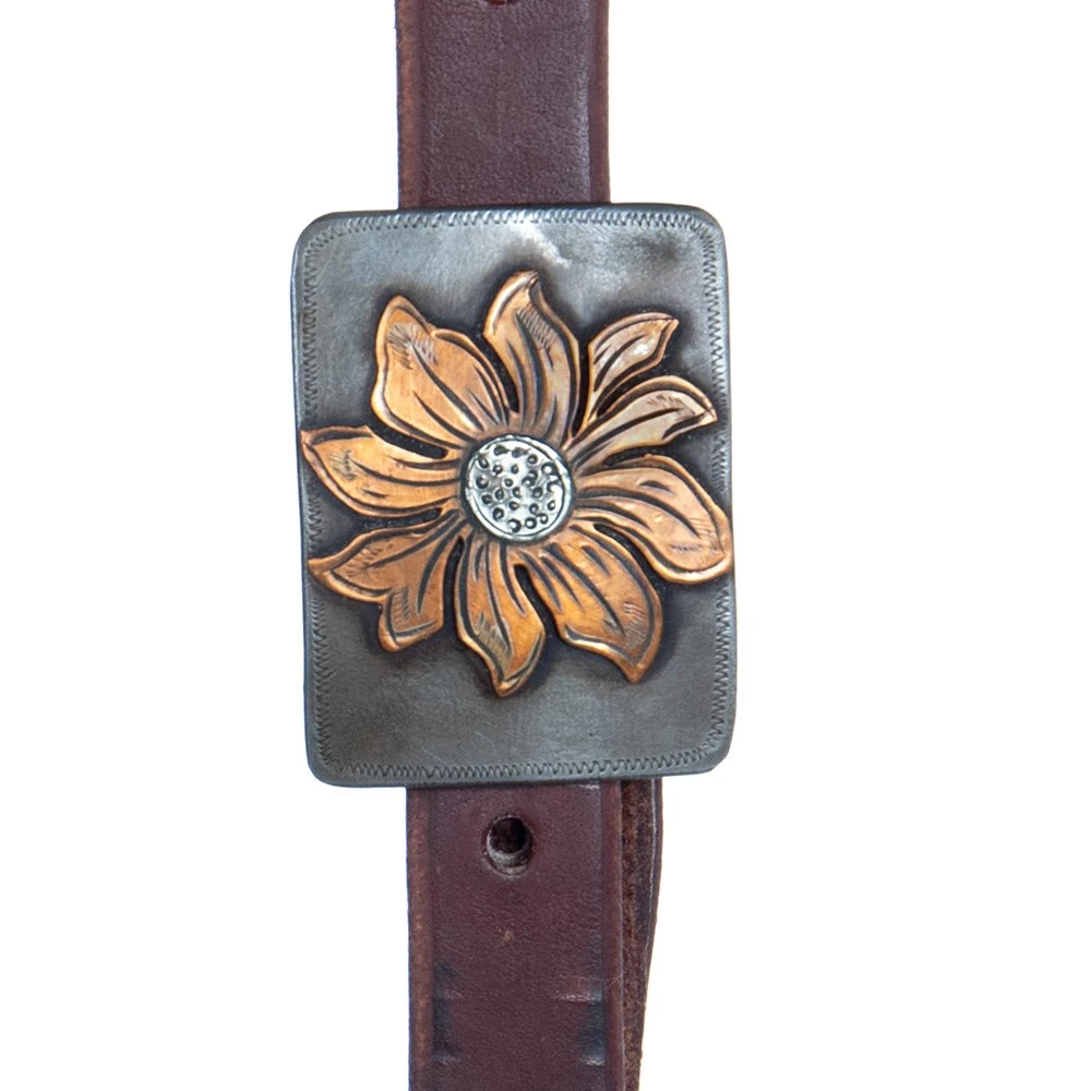 Make your headstall stand out with this custom, handmade NRS buckle. Made with four different metals, the buckle is an illustration of the American West, complete with hand drawn copper flower. This buckle is pictured on a 3/4″ slit ear headstall, equipped with premium bit tie ends.