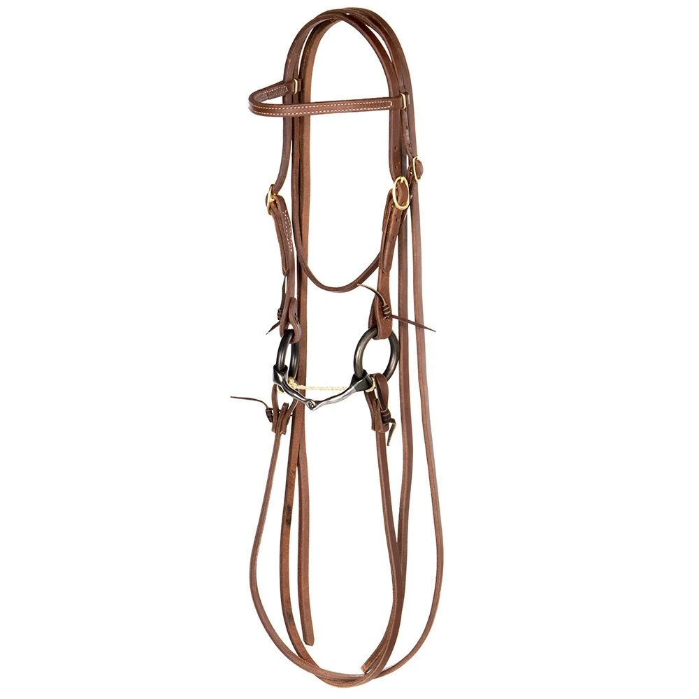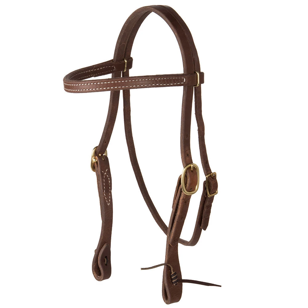 - The oiled harness leather headstall comes equipped with a browband, solid brass hardware and a stitched brow piece for extra durability. Riding with a browband promotes balance by applying the same amount of pressure on either side of the horse’s poll versus a split ear.