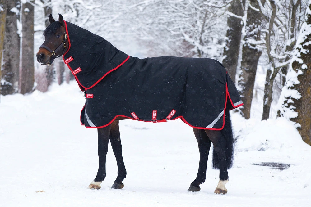 The Rambo Supreme with Vari-Layer is one of our best selling turnouts because of its superior heat retention and maximum comfort. Cut from the strongest and most durable turnout material on the market – Ballistic nylon, this rug is waterproof and highly breathable. Features of this rug include Surefit neck design, V-Front closure, leg arches, reflective strips, wipe clean tail cord, liner loops, three secure cross surcingles, shine enhancing polyester lining, detachable hood included.
