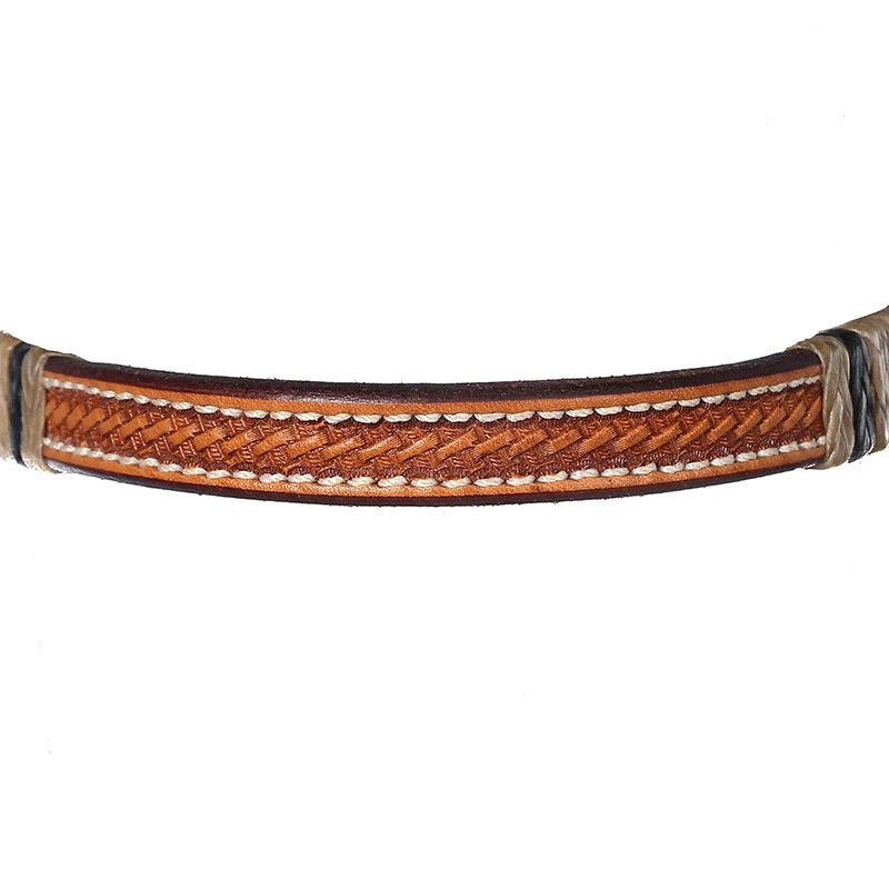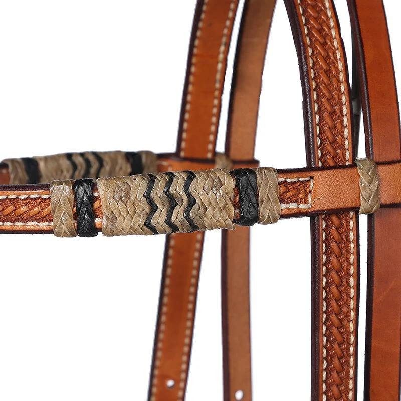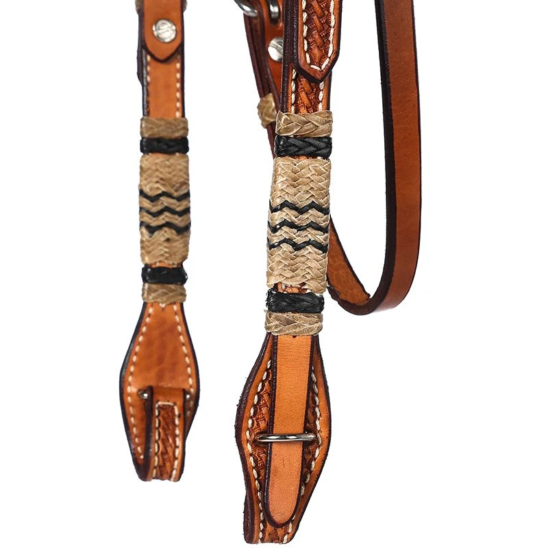 This is a beautiful browband headstall. It is embelished with rawhide cheek pieces, keepers, and browband. The leather is heavily oiled, and the bit ends are quick change.