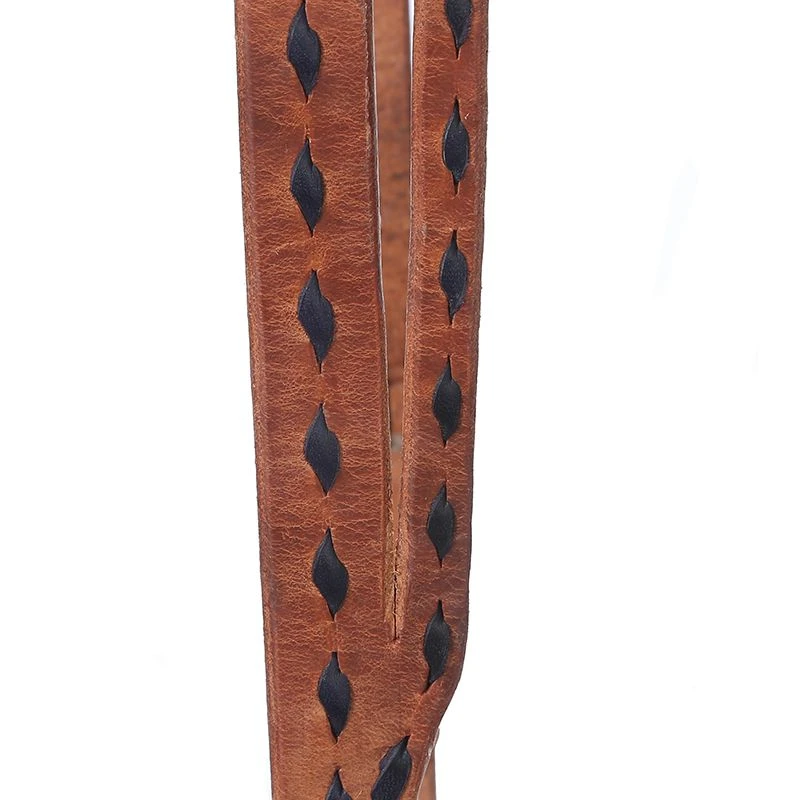 A punchy hedstall with just a little flash!ย The navy buckstitching will make your horse stand out. The leather is naturally colored and is 3/4″ thick.