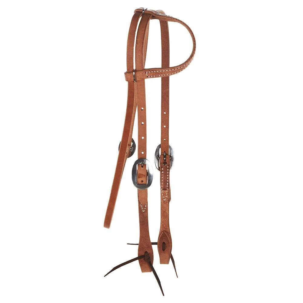 NRS Single Ear Tie End Headstall w/Throat Latch is constructed out of premium Hermann Oak harness leather. This headstall is a game changer for those horses that will not keep a regular single ear headstall on. NRS-SEHOTL