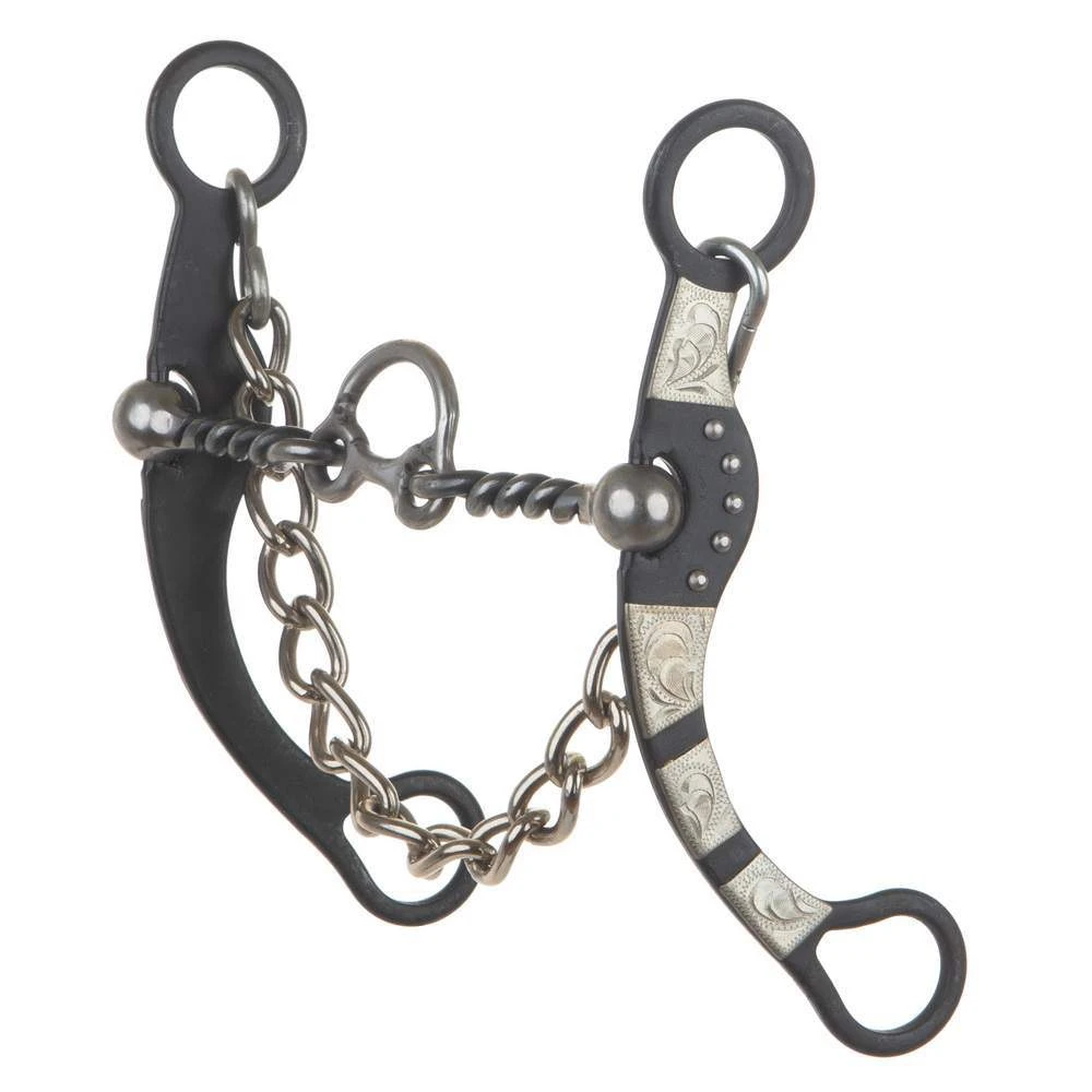 This 5 inch twisted wire cricket port bit features 7-1/2in cheeks with Mounted German Silver design.