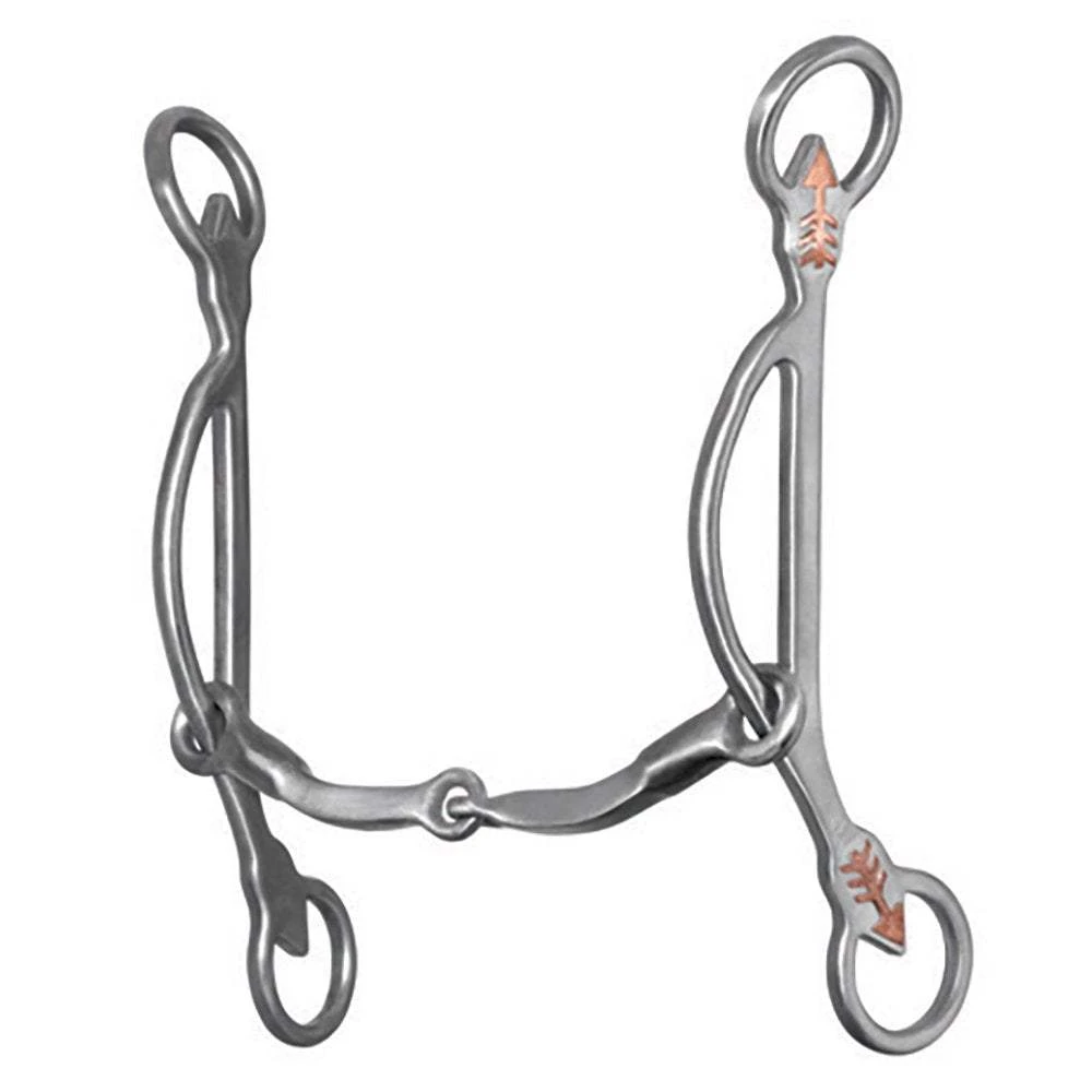 This is a beautiful bit from the new Emilie Veillette Barrel Racing Collection. This bit can be used in other disciplines as well. This bit has just a basic smooth snaffle with a sliding gag. The Copper Arrows on the side give this bit a nice finishing touch.