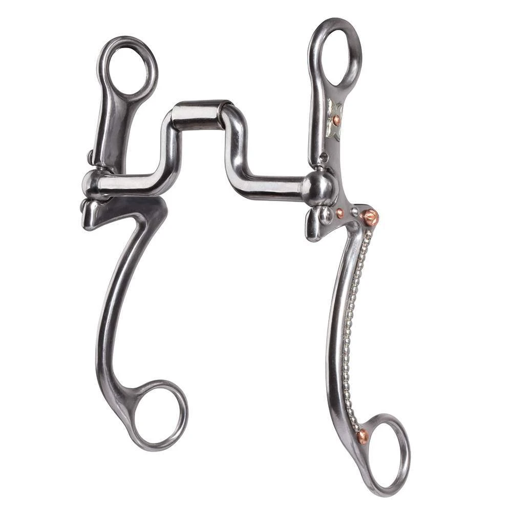 Professional’s Choice 7 Shank Collection w/Dots Swivel Port Bit provides both collection and independent cheek action. This aids in lifting shoulders on at a time. PCB-1054