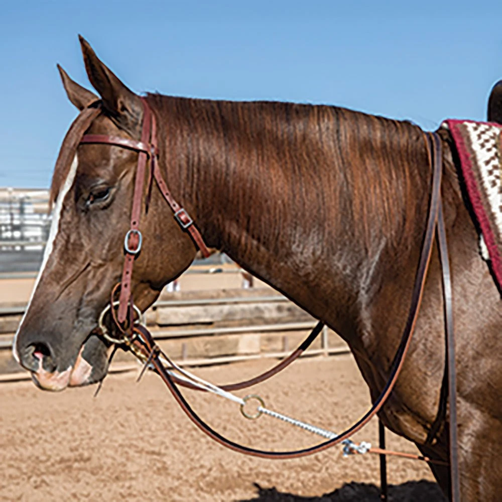Harness leather with bronze hardware, bungee cord center, sliding nylon rope with snap ends. When the head-setter is adjusted to the desired headset, the horse feels resistance when their head raises and will be rewarded when the head is returned to the desired level. Snaps directly to the bit.