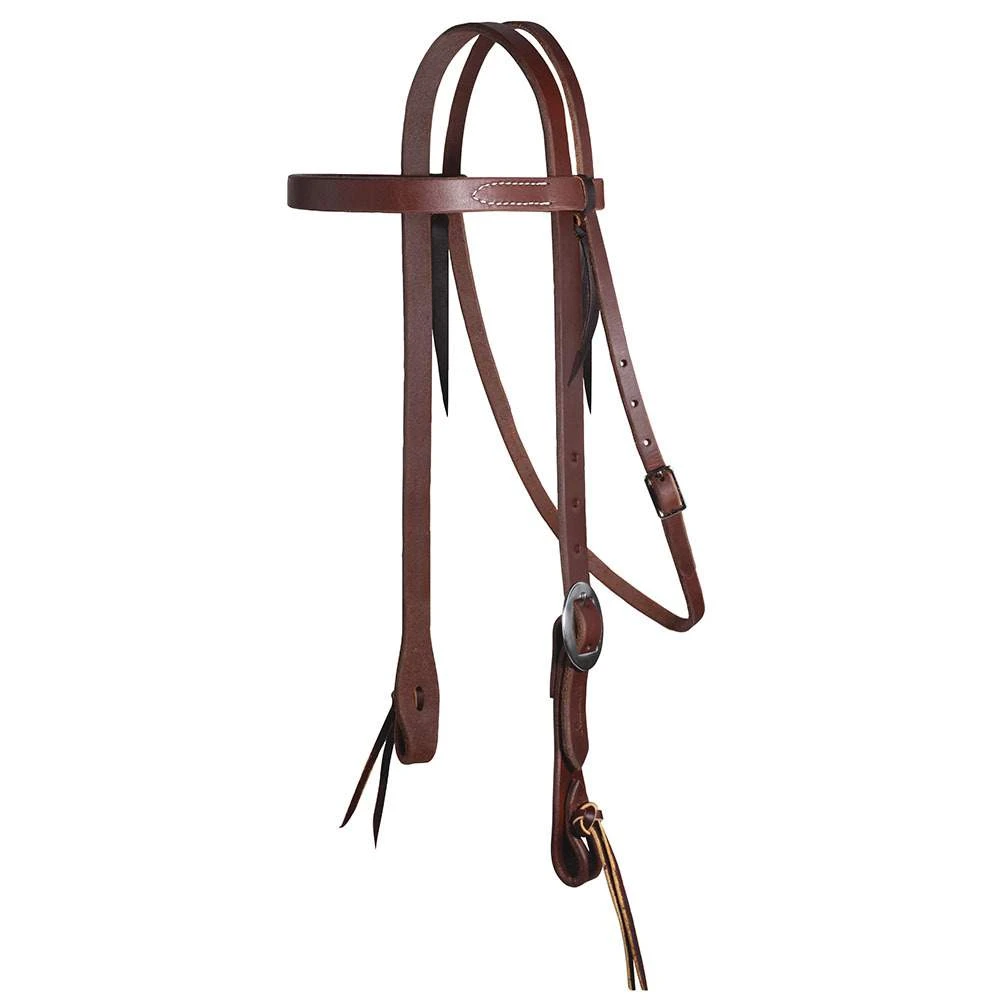This Professional’s Choice browband headstall is constructed of heavy harness leather that has been hand rubbed, then treated with their special heavy oil dressing. Quick-change pineapple knots at the bit, stainless steel buckles.