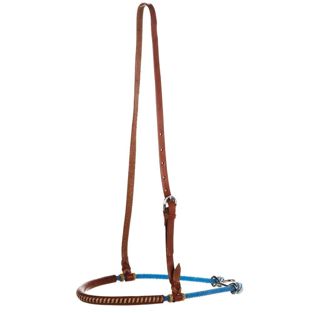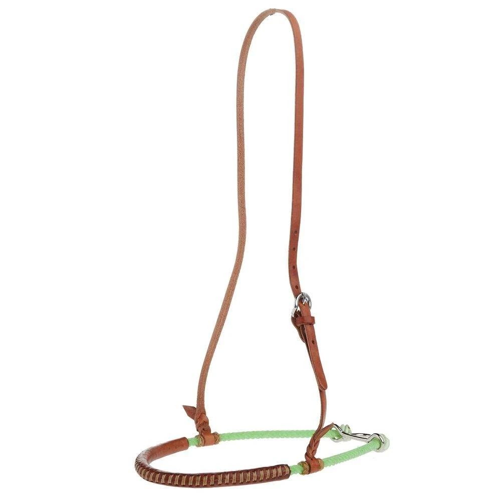 Top Hand Rope single rope, brown harness noseband. Handmade with rawhide lace and braided rawhide keeper. Plus, stainless steel/brass hardware. Available in three colors; Red, Blue, Green. TH-NB1