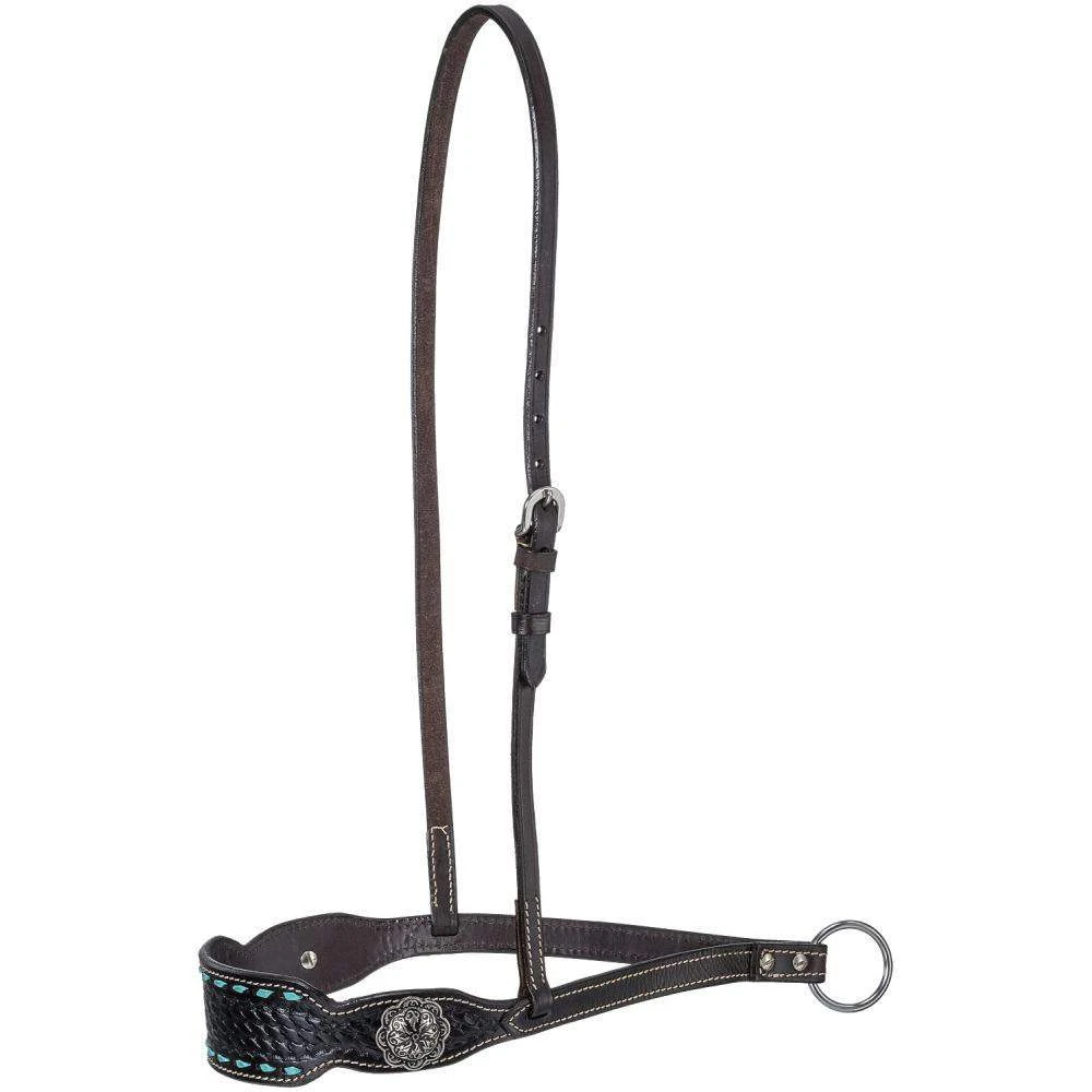 This stunning Bryson Tie Down Noseband is made with premium dark oiled leather and constructed with a white single stitched edge. The hand stamped basket weave tooling keeps this set in a traditional style, but a pop of turquoise buckstitching gives it a unique look. Complete with stainless steel hardware. This is popular for barrel racers and ropers. 45-9909