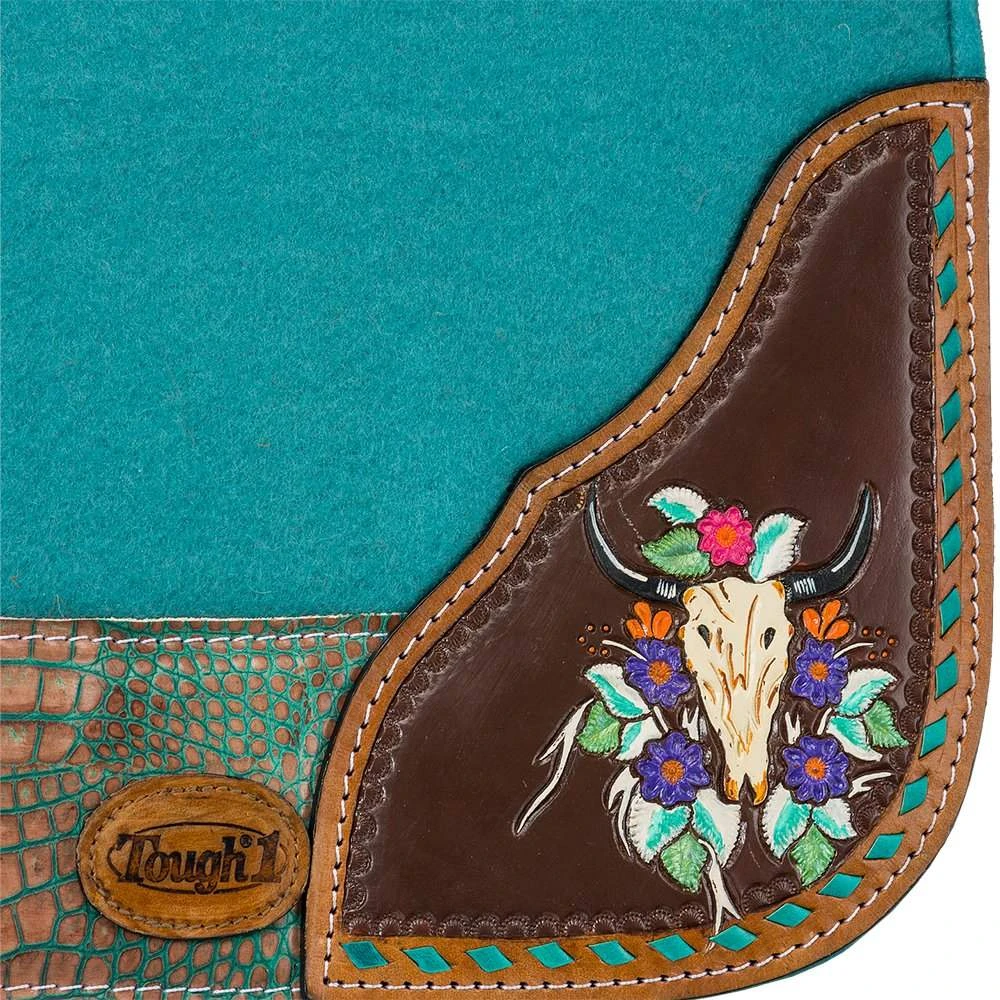 Bright aqua felt is accented with brown/aqua faux croc wear leathers and hand tooled steer skull design on leather corners and wither. Aqua buckstitch highlights the hand painted design 31β x 32β