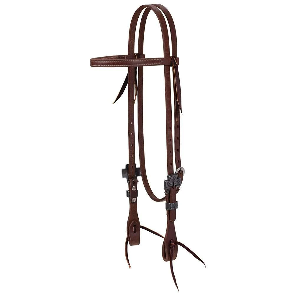 This Weaver Leather headstall is handcrafted from Hermann Oak premium russet harness leather that’s dipped in oil, dressed with saddle butter and hand rubbed for an exceptional feel. Exclusive designer hardware features stainless steel buckles and loop with a light blackening finish and black rasp accents.