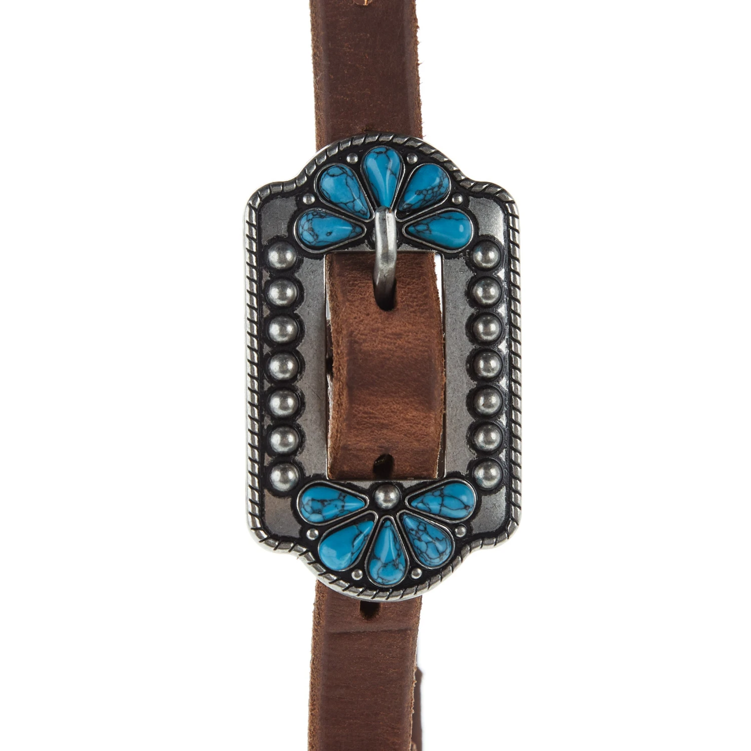 This Weaver Leather headstall is handcrafted from Hermann Oak premium russet harness leather that’s dipped in oil, dressed with saddle butter and hand rubbed for an exceptional feel. Exclusive designer hardware features antique nickel zinc die cast buckles accented with floral turquoise stone design.